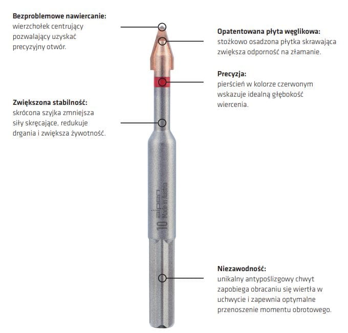 Idealne mocowanie we wszystkich uchwytach wiertarskich dzięki unikalnemu, antypoślizgowemu chwytowiWiercenie bez pęknięć