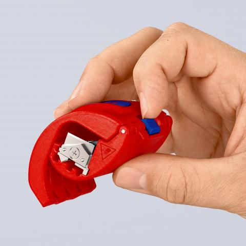 Pomysłowy obcinak do rur: przecina rury bez pozostawiania wiórów oraz wygodnie leży w dłoni. Błyskawicznie przecina m.in. rury ściekowe o wysokiej temperaturze i puste rury elektryczne. Do skracania tulejek uszczelniających znajdujących się blisko ścian podczas montażu końcowego, zgodnie z normami. Cięcie niezbrojonych rur z tworzyw sztucznych od Ø 20 do 50 mm o grubości ścianki do 2,4 mm. Czyste i bezwiórowe cięcie rur w mgnieniu oka. Cięcie tulejek uszczelniających w odległości ok. 2-3 mm od ściany. Obrotowy blok noży do cięcia rur z tworzywa sztucznego (ostrze w środku) lub tulejek ociekowych i uszczelniających (ostrze na zewnątrz). Z mechanizmem blokującym umożliwiającym bezpieczny transport. Dwa zapasowe noże zintegrowane w narzędziu.